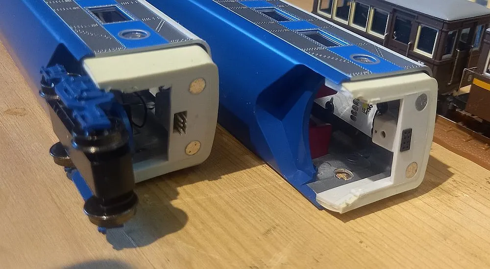 hier ein Link zur Ersatzteilliste und Anleitung um die Wagen zu öffnen. Die Magnete scheinen die Faltenbälge zu halten, ansonsten gibt es noch eine elektrische Verbindung die gelöst werden muss.