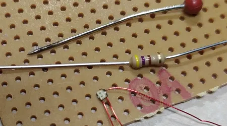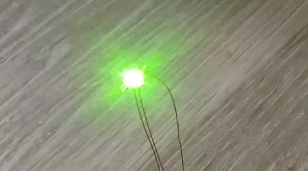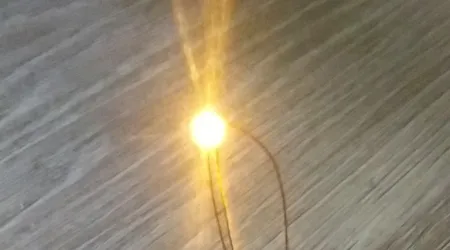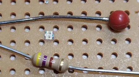 Zum Vergleich habe ich die LED mal auf eine 2,54er Lochraster Platine gelegt, eine Stecknadel und einen 1/4 W Widerstand dazu.