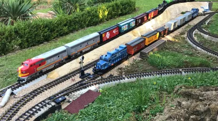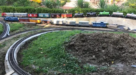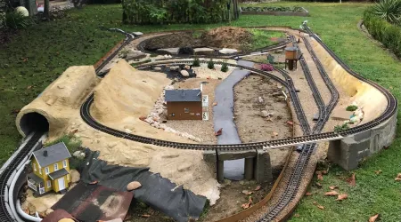 Aber erst einmal vom Gartenbahn-Fieber gepackt, ist es dabei natürlich nicht geblieben. Habe gerade diese Woche meine etwas größere Außenstrecke fertiggestellt (zumindest Gleis technisch). Sie ist das Resultat meiner Erkenntnis, dass US-Züge lang sein sollten und entsprechenden “Auslauf” benötigen.
