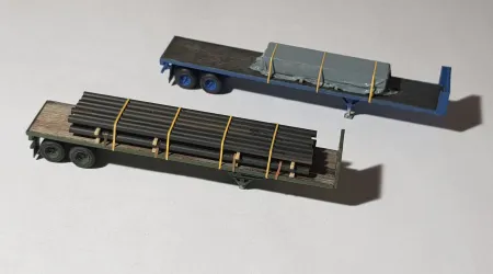 May 5, 2025 at 10:09 PM #1 Hi,ich hatte mir Flattrailer mit Rohrladung in den Kopf gesetzt. Industriell gab es mal von Trainworx 40er, ich hab nie einen in die Finger gekriegt. Also selber bauen (bis auf Achsen und Achshalter, die sind von MTL)