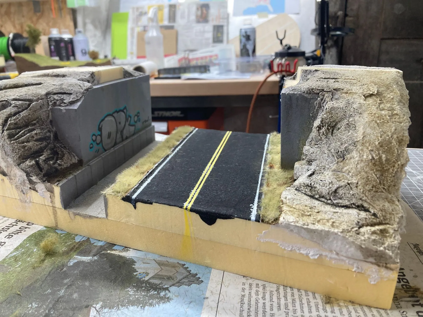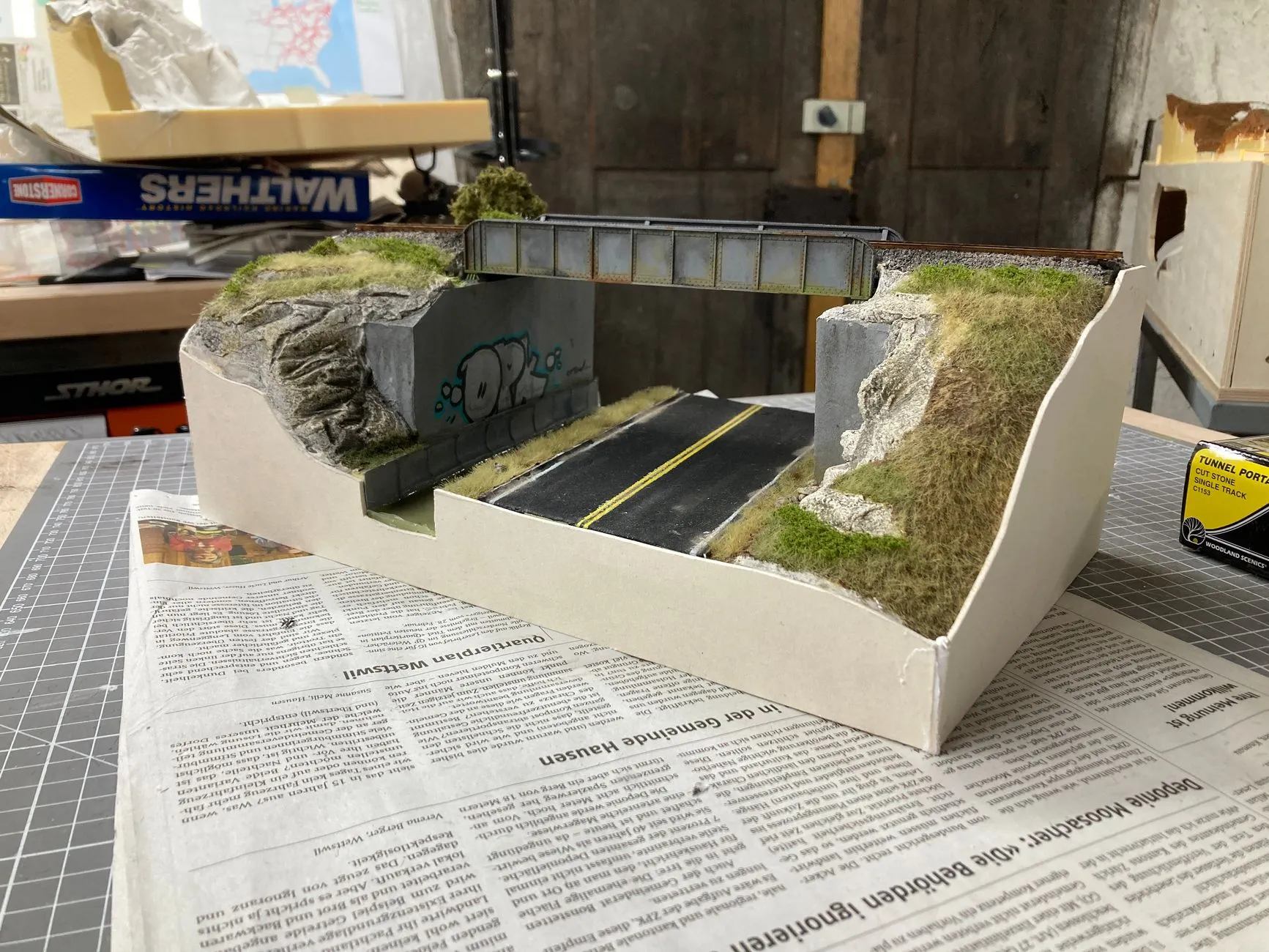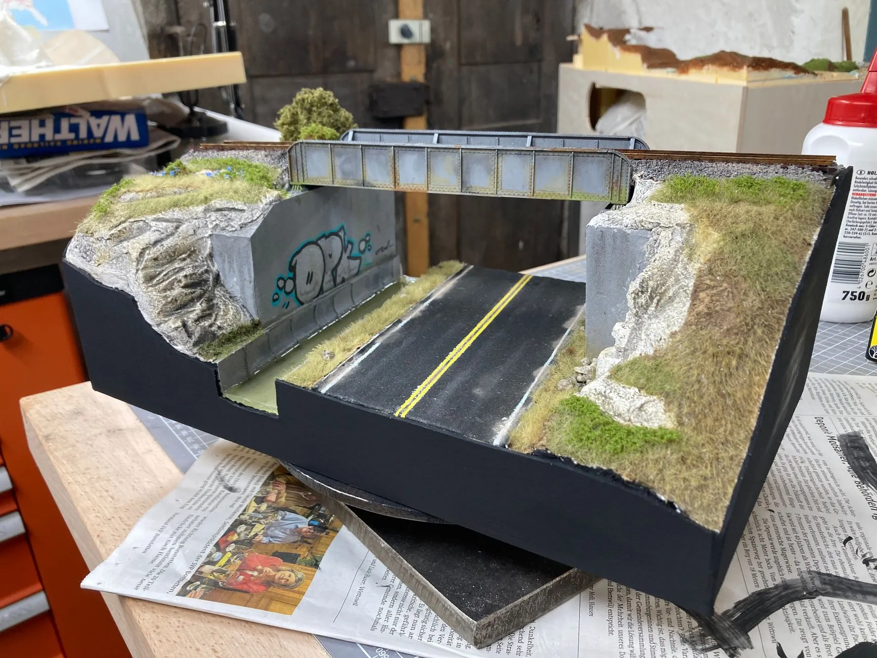 Nach dem Workshop hatte ich die Idee, ein weiteres Diorama zu bauen und die erlernten Skills umzusetzten. Da ich noch einige Brücken an Lager hatte (und noch immer welche habe). Entschied ich mich für ein Diorama mit Brücke.