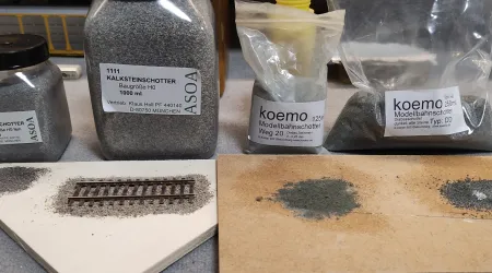 Für einen neuen Anlagenteil möchte ich gerne mal einen ganz anderen Gleisschotter verwenden. Mir schwebt farblich ein hellgrauer Schotter für die Mainline und Siding vor, der aussieht als wäre er vor nicht allzu langer Zeit erneuert worden. Das letzte mal als ich hellgrauen Schotter für ein Diorama verwendet habe nahm ich ASOA Kalksteinschotter. Dieser dunkelt aber beim benässen und befestigen etwas nach. Egal ob mit dem klassischen Wasser Leim Gemisch oder mit Latexkleber. Beim einschottern hätte er aber die gewünschte Farbe.