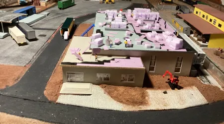 Dort kommt dann die Rock Salt Verpackung hin. Anlieferung in corved hopper. Entleerung im weißen Gleisstück rechts am Ende. Die freie Fläche ist Baugrube.