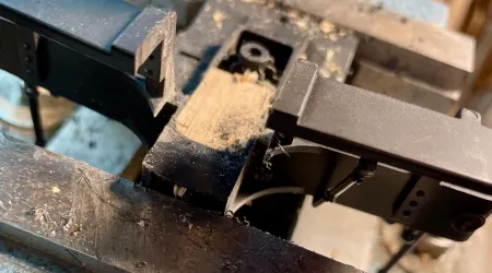 Beim ersten Testlauf entgleiste der Tender auf der Weiche. Bei dem war die Spurweite etwas unter 40 mm und habe diese auf 40,3, gebracht. Dabei ist mir aufgefallen das der Tender in der Regel zuerst anläuft und auf die Lok aufläuft. Das sieht bescheiden aus. Da ist ein 6 mm Zapfen am Tender für ein 11mm Langloch an der Lok. Abhilfe brachte eine 10 mm Hülse, aufgepresst auf den Zapfen.