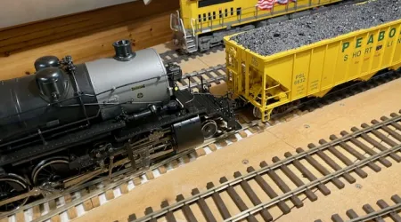 Soviel mir bekannt hat die Lok viel als Pusher gearbeitet, das möchte ich nachbilden. Der Kupplungsschacht sitzt aber für eine Kadee 1906 satte 1 cm zu hoch. Also ein kleines Füllstück eingeklebt und mit der Schablone die richtige Höhe ermittelt, den Überstand dann weggefräst. Laufen tut sehr gut, ich fahre mit ca. 5-6 Meilen/h , das wirkt am besten. Die Lok hat drei Raucher drin, vorne, hinten und eine Dampfpfeife welche ich noch nicht in Betrieb hatte. So nach 20 min ist die Bude blau und du musst flüchten…. Deshalb fahr ich lieber ohne Qualm.