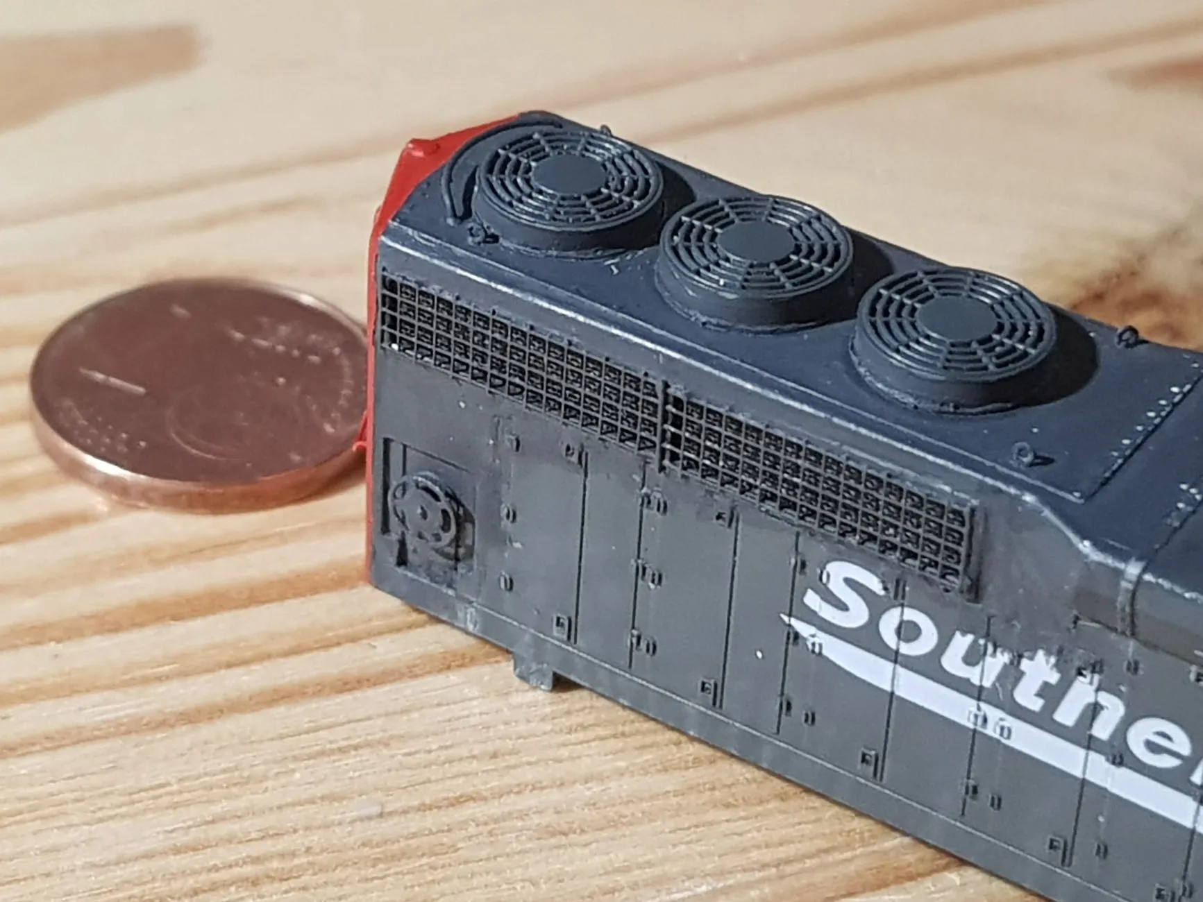 Noch bin ich bei Plan A, nach tausendmal spachteln ist der Body fertig, Lüfter wieder drauf und die Lackierung gerettet, selbst der Farbton passt. den Rest macht eine dezente Alterung, sauber waren SP-Loks eher selten ;-). Fehlen nur noch die geäzten Gitter das typische SP Light Package hatten diese SD40-M2 nicht, selbst die nicht, die vor dem Umbau SP-Loks waren.